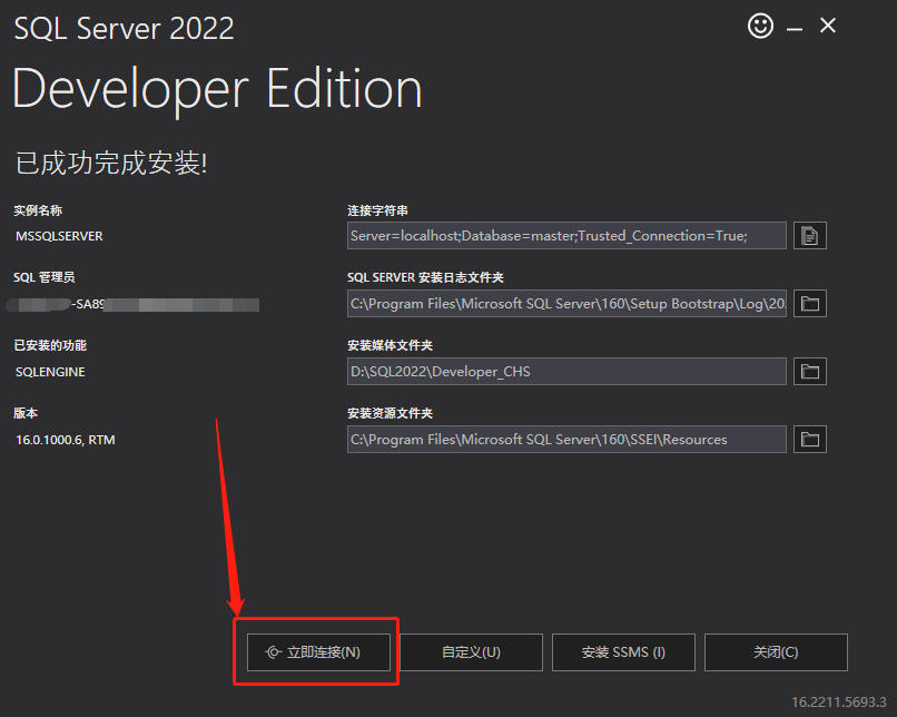 完成安裝后,SQL Server會(huì)自動(dòng)轉(zhuǎn)入操作界面,我們?cè)谶@里點(diǎn)擊下方的立即連接按鈕。