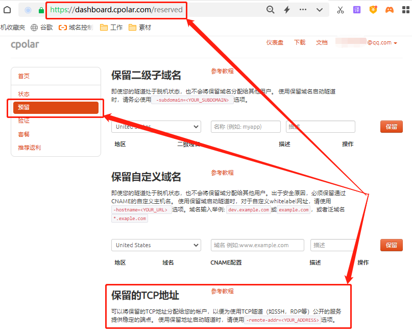 首先,我們登錄cpolar客戶(hù)端,在儀表臺(tái)頁(yè)面左側(cè)找到預(yù)留按鈕,進(jìn)入數(shù)據(jù)隧道的“預(yù)留”頁(yè)面。