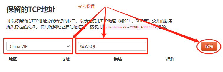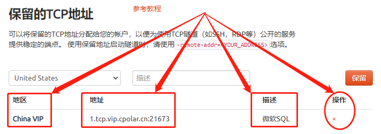 在cpolar的預(yù)留頁(yè)面,我們找到保留的TCP地址欄位,為我們要連接的SQL Server設(shè)置一個(gè)公網(wǎng)地址,這個(gè)地址可以看做是數(shù)據(jù)隧道的入口,也可以理解為空白數(shù)據(jù)隧道(畢竟這里設(shè)置的隧道入口還沒(méi)有關(guān)聯(lián)本地軟件的輸出端口)。