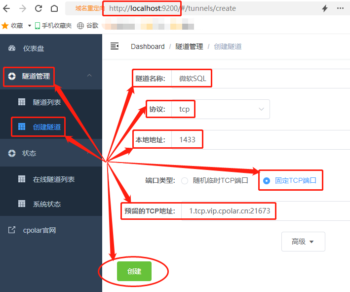 在完成這些設(shè)置后,就可以點(diǎn)擊下方的創(chuàng)建按鈕,將cpolar云端保留的空白數(shù)據(jù)隧道與本地SQL輸出端口連結(jié)起來(lái)。