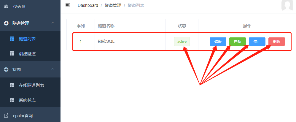 完成本地?cái)?shù)據(jù)隧道的創(chuàng)建后,cpolar客戶(hù)端會(huì)自動(dòng)跳轉(zhuǎn)至隧道管理項(xiàng)下的隧道列表頁(yè)面。