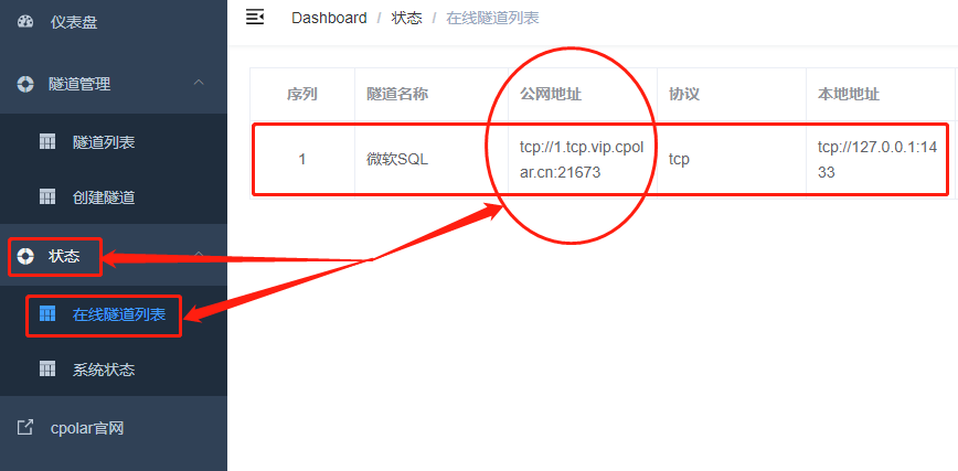 完成cpolar客戶(hù)端的設(shè)置后,我們可以點(diǎn)擊狀態(tài)項(xiàng)下的在線(xiàn)隧道列表頁(yè)面,找到遠(yuǎn)程訪(fǎng)問(wèn)本地SQL Server的地址(也就是隧道入口),我們將這個(gè)地址粘貼到不同的遠(yuǎn)程數(shù)據(jù)庫(kù)管理軟件中,就能連接到本地的SQL Server上。