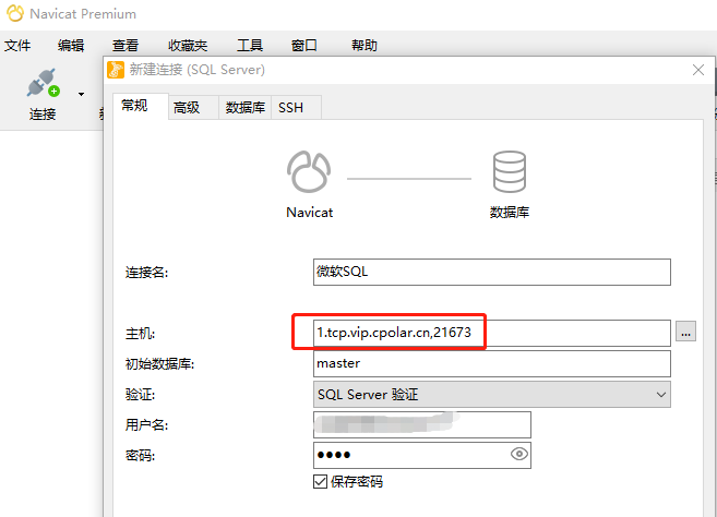 或者使用Navicat工具,在連接頁(yè)面的主機(jī)欄位,填入cpolar生成的地址(去掉最前面的tcp://,并將末尾數(shù)字端口號(hào)前的冒號(hào):改為逗號(hào),)