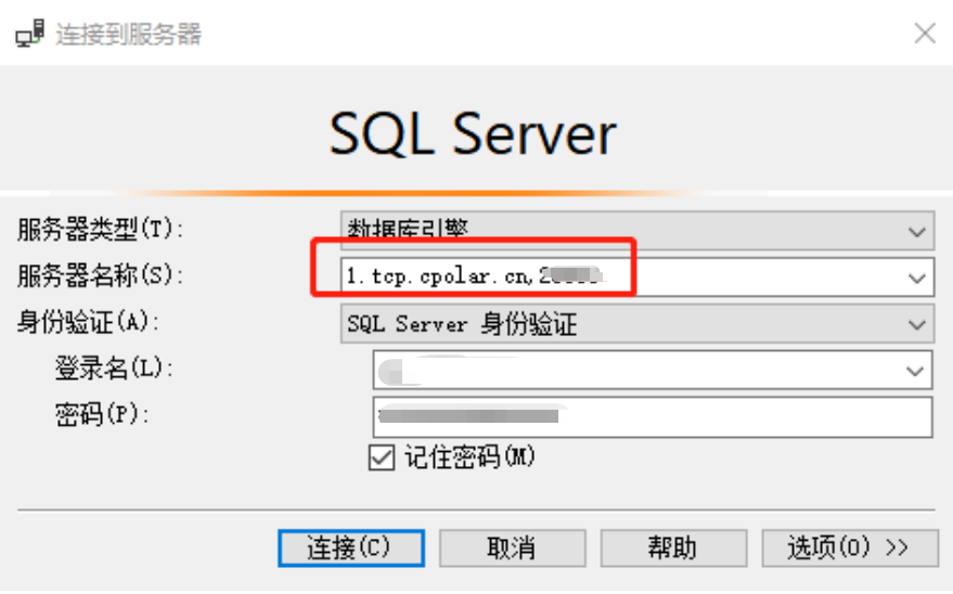 同理,我們還能使用SSMS圖形界面進(jìn)行遠(yuǎn)程連接,同樣在連接界面,將cpolar生成的地址粘貼到服務(wù)器名稱(chēng)欄位(去掉最前面的tcp://,并將末尾數(shù)字端口號(hào)前的冒號(hào)“:”改為逗號(hào)“,”),就能連接到本地電腦上的SQL Server。