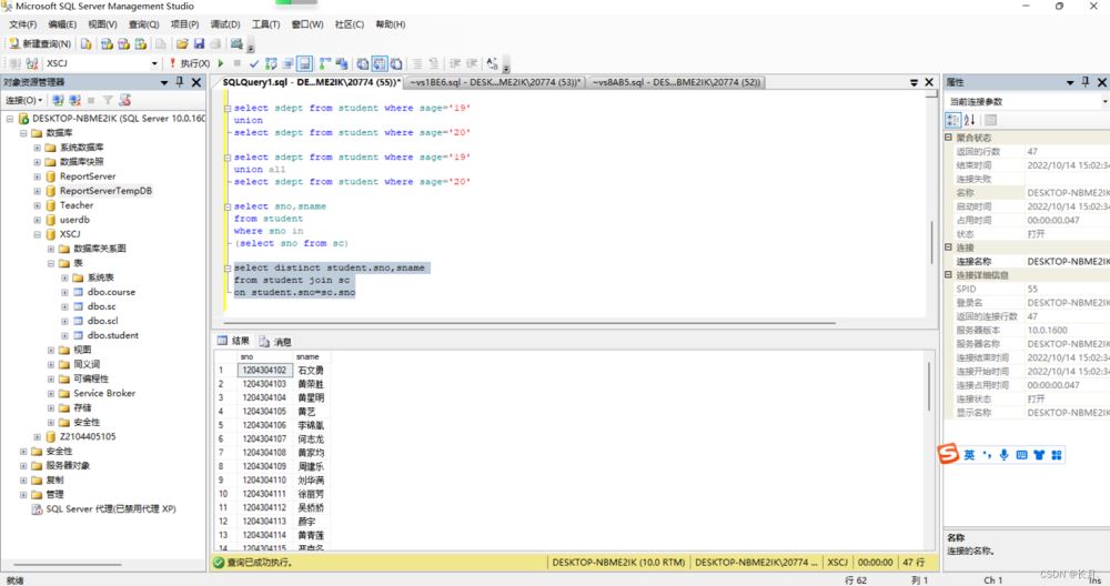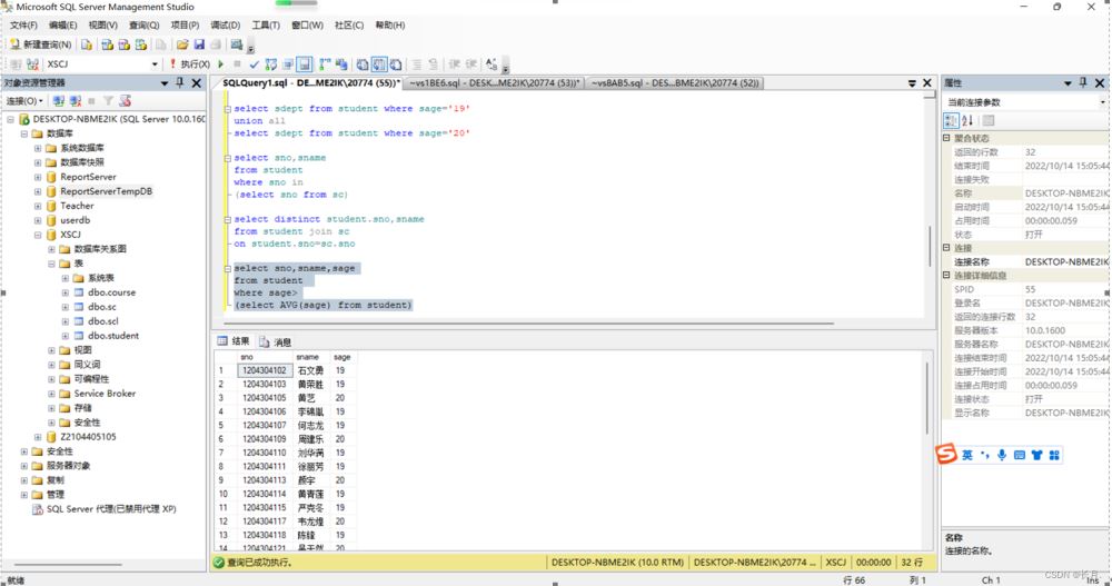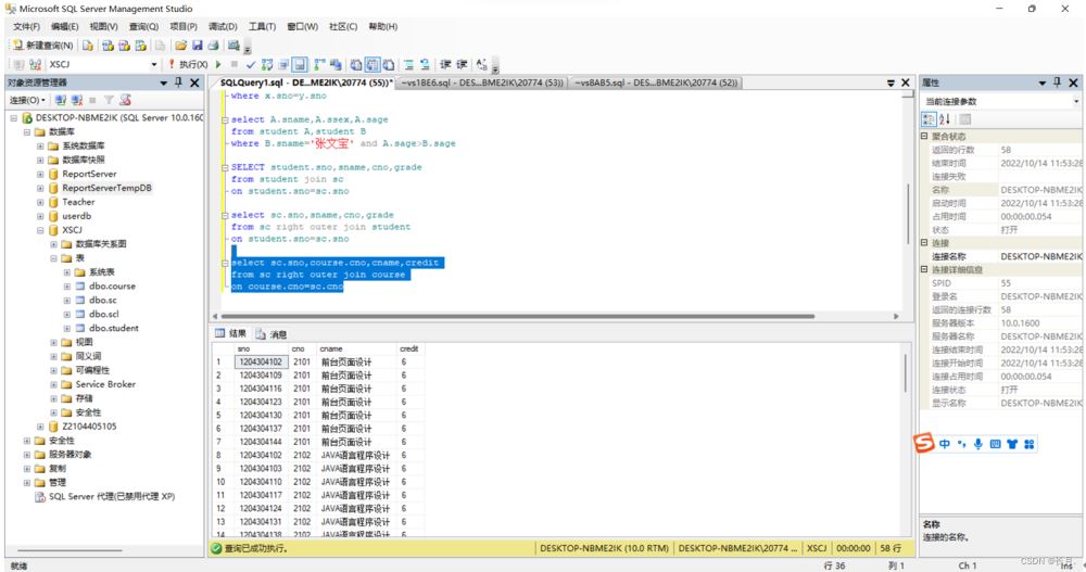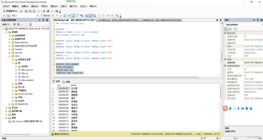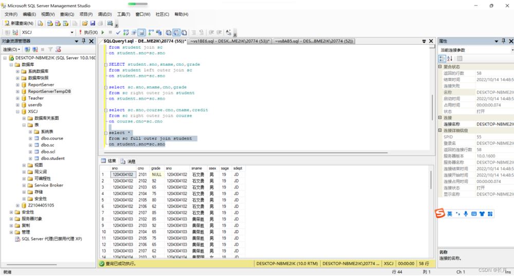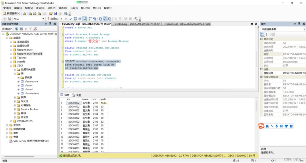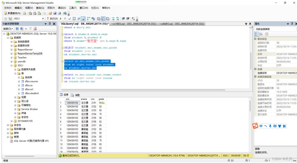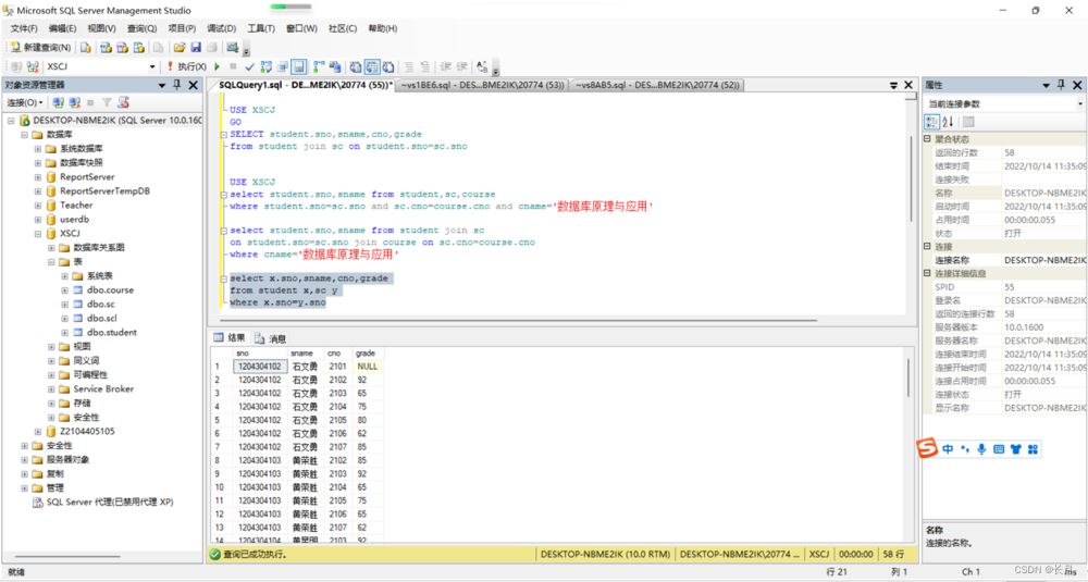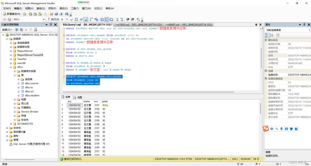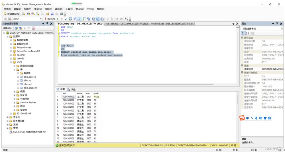 USE XSCJGOSELECT student.sno,sname,cno,grade from student,scwhere student.sno=sc.sno