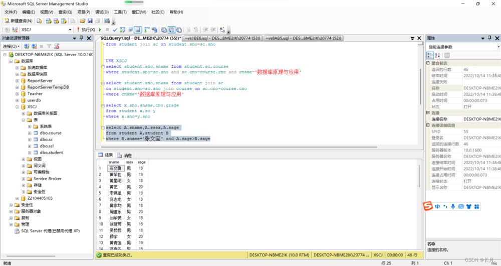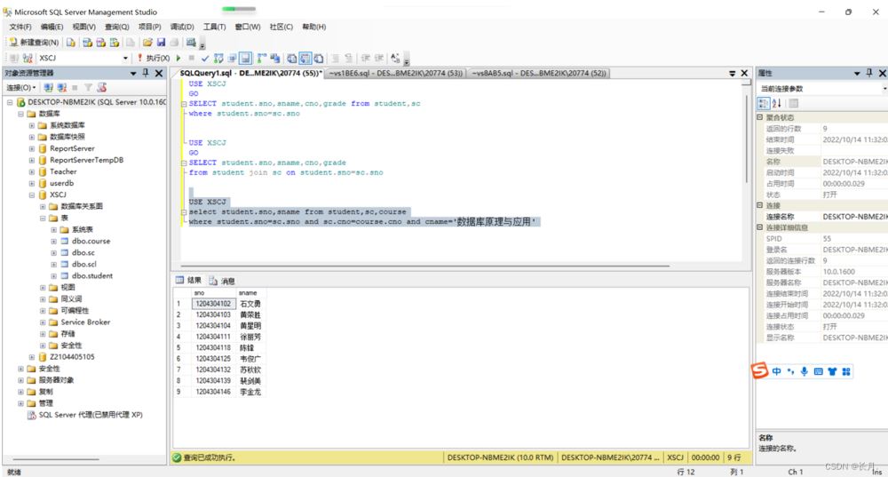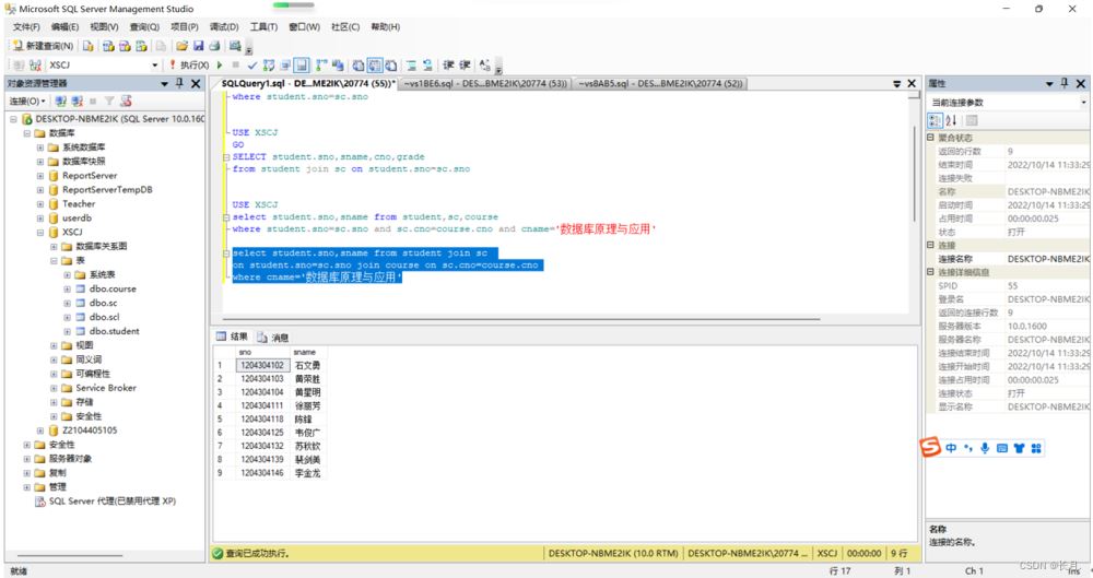 USE XSCJselect student.sno,sname from student,sc,coursewhere student.sno=sc.sno and sc.cno=course.cno and cname="數據庫原理與應用"