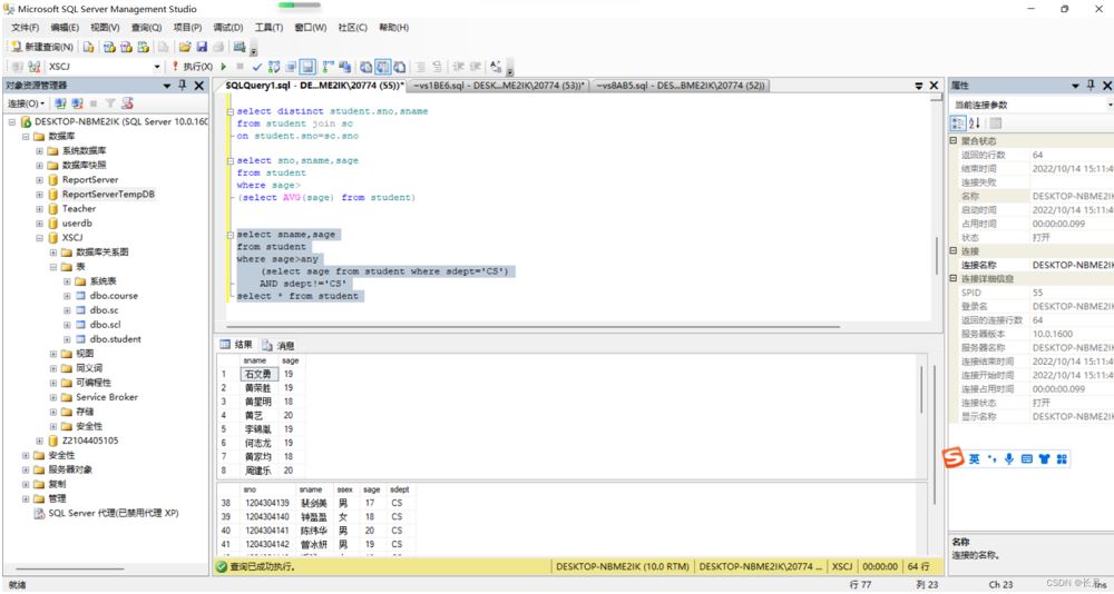 select sname,sagefrom studentwhere sage>any (select sage from student where sdept="CS") AND sdept!="CS"select * from student
