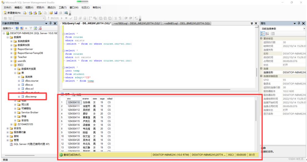 select *into tempfrom student where sdept="CS"select * from temp