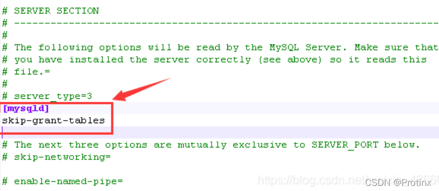 1、找到mysql的my.ini文件,在mysqld關(guān)鍵字下面添加skip-grant-tables,如下圖所示: