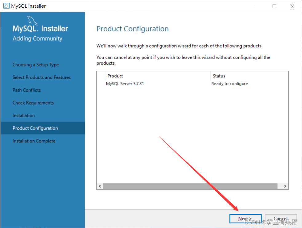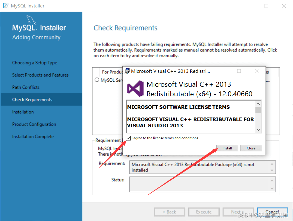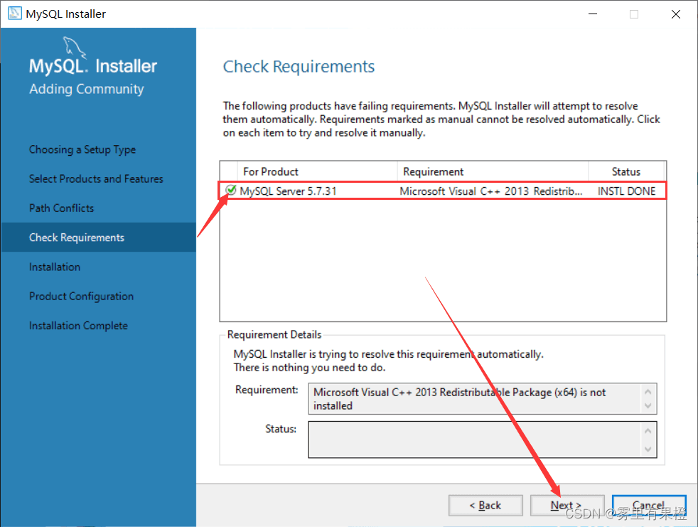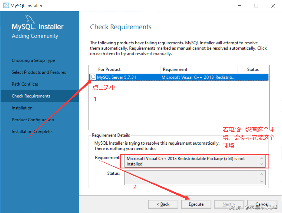 先選中“MySQL Server5.7.31”,若電腦中沒有這個環境,會提示安裝“Microsoft Visual C++ 2013”環境,點擊“Execute”