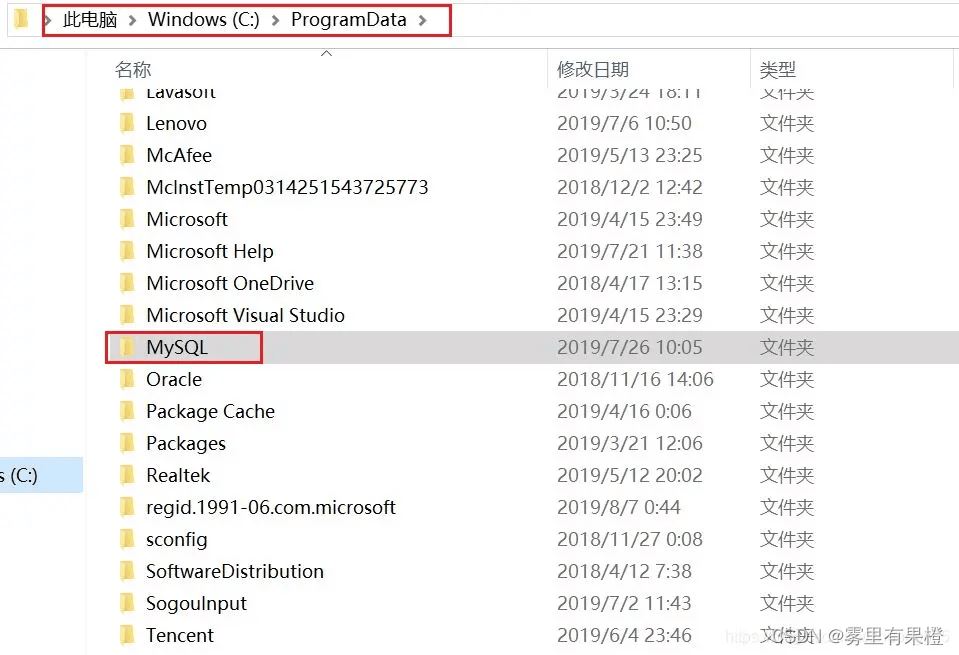 第二步,刪除上次安裝目錄的MySQL殘留文件,更不要忘了刪除ProgramData下的MySQL文件夾,如下圖所示。注意:這里的文件夾與上次安裝目錄里的殘留文件不同,C:\ProgramData 一般默認是隱藏的。