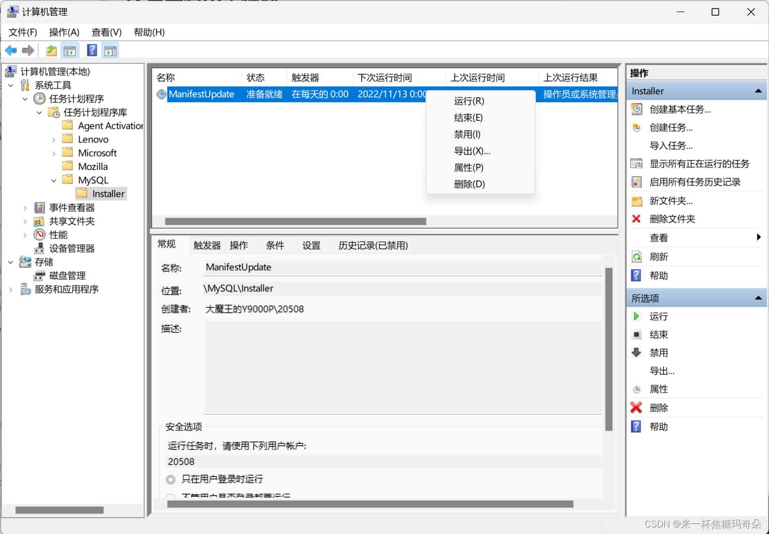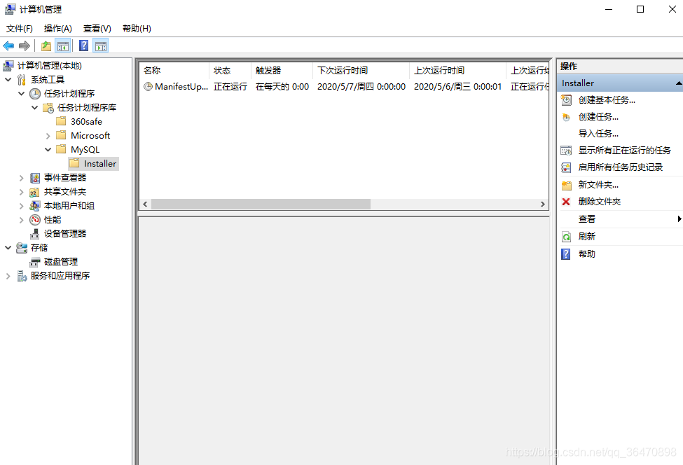 3、選擇“MySql”,點擊Installer,可見任務每天晚上12點自動觸發,右鍵將任務刪除。