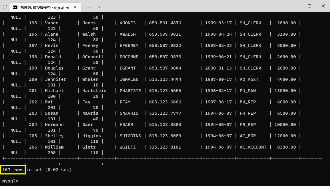 共有107行的員工表。