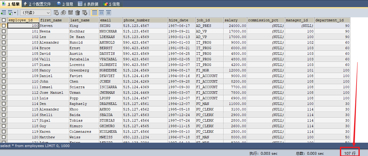 一共107條員工信息,與例子1的數目一致,導入成功。