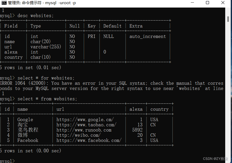 INSERT INTO `websites` VALUES ("1", "Google", "https://www.google.cm/", "1", "USA"), ("2", "淘寶", "https://www.taobao.com/", "13", "CN"), ("3", "菜鳥教程", "http://www.runoob.com", "5892", ""), ("4", "微博", "http://weibo.com/", "20", "CN"), ("5", "Facebook", "https://www.facebook.com/", "3", "USA");(4)查看所創表結構和表的數據