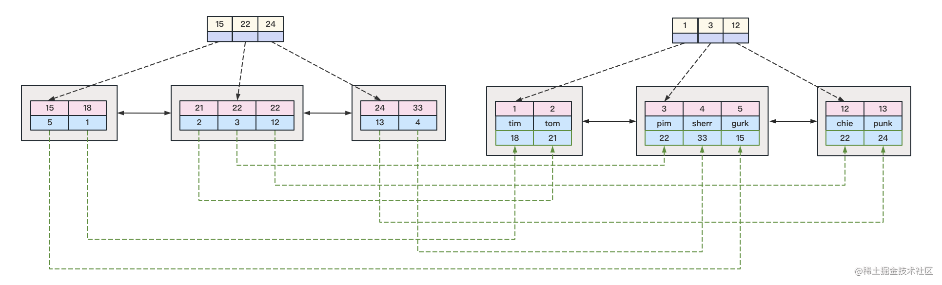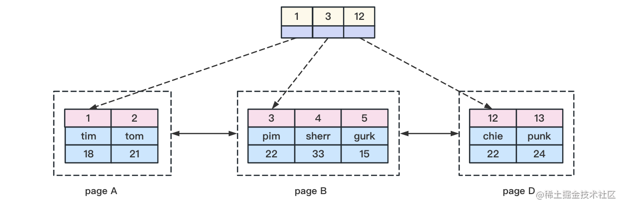 從上圖中我們可以看到,最上頭是非葉子結點,這種非葉子結點里面存儲的是主鍵id的值,而非葉子結點的內部會有個數據頁的指針,這些指針會指向下層的B+樹節點,一般B+樹的最底層我們稱之為葉子結點。在聚簇索引的葉子結點里面,會存儲主鍵id和對應的行記錄內容。