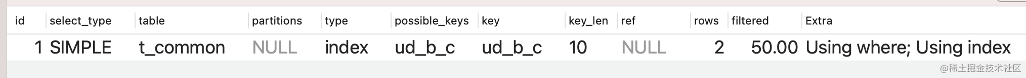 可以看到這條sql需要從mysql中檢索出a,b,c,d四個字段,走的是全表掃描,并沒有走索引。
