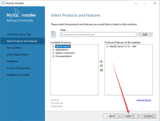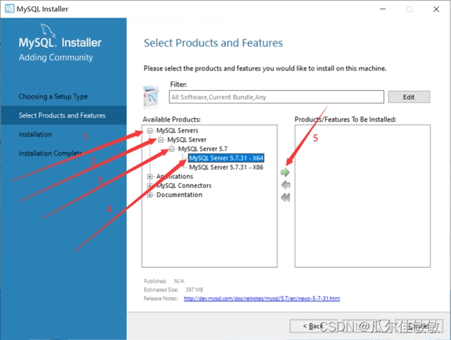 依次點開“MySQL Servers”、“MySQL Servers”、“MySQL Servers 5.7”、“MySQL Servers 5.7.31 -64”,然后點擊綠色箭頭將選中的版本移植到右邊選中框中,這里選擇的是64位系統