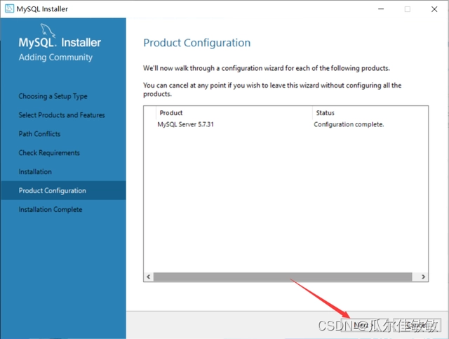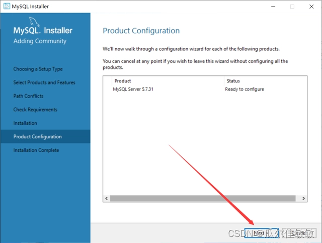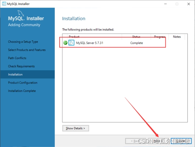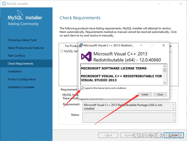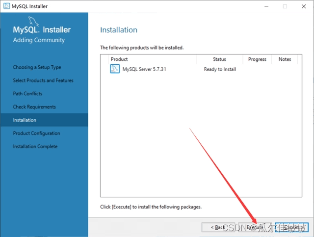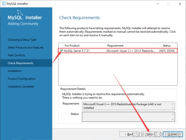 9. 先選中“MySQL Server5.7.31”,若電腦中沒有這個環境,會提示安裝“Microsoft Visual C++ 2013”環境,點擊“Execute”