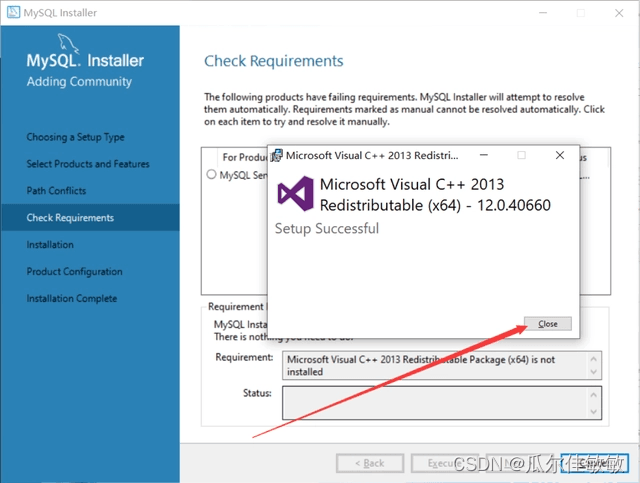 - 9. 先選中“MySQL Server5.7.31”,若電腦中沒有這個環境,會提示安裝“Microsoft Visual C++ 2013”環境,點擊“Execute”