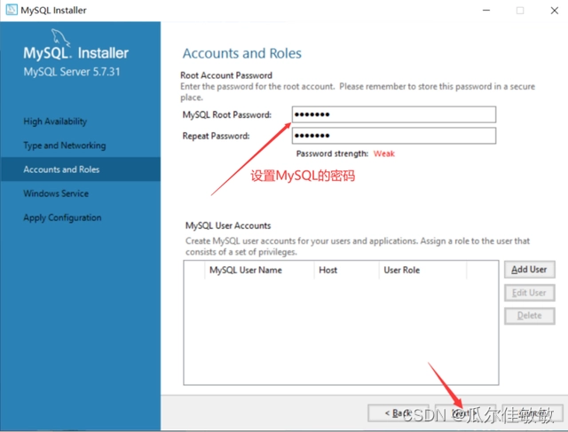 - 19. 這里需要設置MySQL的密碼,不需要太復雜,設置完了直接點擊“Next”