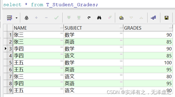 ?select * from T_Student_Gradespivot(min(grades)for name in ("張三" as 張三,"李四" as 李四,"王五" as 王五))where 張三="90"返回結果如下:按指定科目統計所有學生的最低成績,并將學生姓名字段行轉列,并且只顯示數學這一科目的成績(此時雖然用到了聚合函數max,由于SUBJECT字段也一并顯示,因此max函數并沒有起到效果,依舊是顯示每一個學生的各科具體成績)。