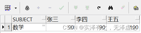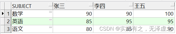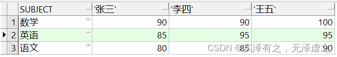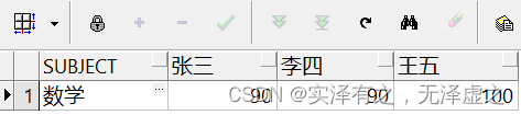 select * from T_Student_Gradespivot(max(grades)for name in ("張三" as 張三,"李四" as 李四,"王五" as 王五))where subject="數學"返回結果如下:按指定科目統計所有學生的最高成績,并將學生姓名字段行轉列,并且只顯示數學這一科目的成績(此時雖然用到了聚合函數max,由于SUBJECT字段也一并顯示,因此max函數并沒有起到效果,依舊是顯示每一個學生的各科具體成績)。