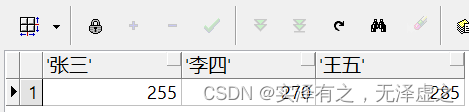 select * from (select name,grades from T_Student_Grades)pivot(sum(grades)for name in ("張三","李四","王五"))返回結果如下:統計每一個學生的所有科目總成績,并將學生姓名字段行轉列(SUBJECT字段沒有顯示)。