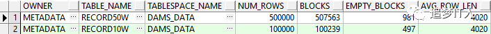 SELECT A.OWNER,A.TABLE_NAME,A.TABLESPACE_NAME,A.NUM_ROWS,A.BLOCKS,A.EMPTY_BLOCKS,A.AVG_ROW_LEN FROM ALL_TABLES A WHERE OWNER="METADATA" AND TABLE_NAME IN ("RECORD10W","RECORD50W")