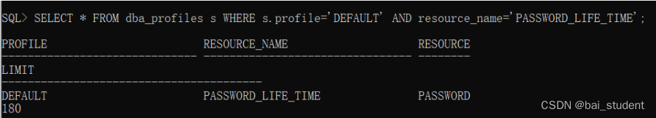 SELECT * FROM dba_profiles s WHERE s.profile="DEFAULT" AND resource_name="PASSWORD_LIFE_TIME";