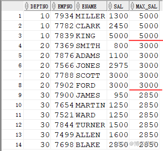 SELECT DEPTNO, EMPNO, ENAME, SAL,last_value(SAL) OVER(PARTITION BY DEPTNO ORDER BY SAL ROWS BETWEEN UNBOUNDED PRECEDING AND CURRENT ROW) MAX_SAL FROM EMP;