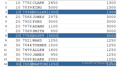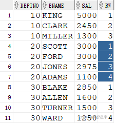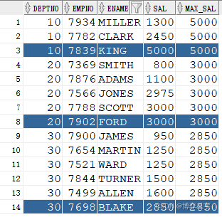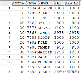 SELECT DEPTNO, EMPNO, ENAME, SAL,last_value(SAL) OVER(PARTITION BY DEPTNO ORDER BY SAL) MAX_SAL FROM EMP;