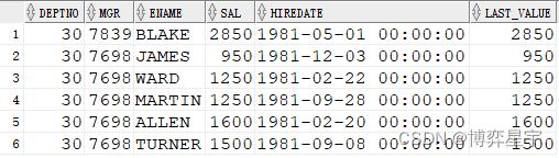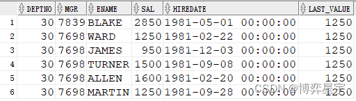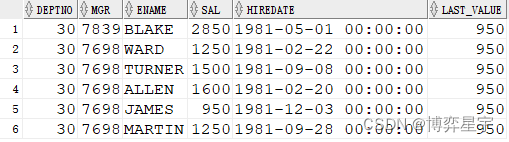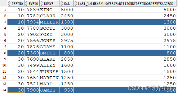 last_value(sal) 的結(jié)果與 order by sal 排序有關(guān)。如果排序?yàn)閛rder by sal desc, 則最終的結(jié)果為分組排序后sal的最小值(分組排序后的最后一個(gè)值), 當(dāng)deptno為10時(shí),max_sal為1300。
