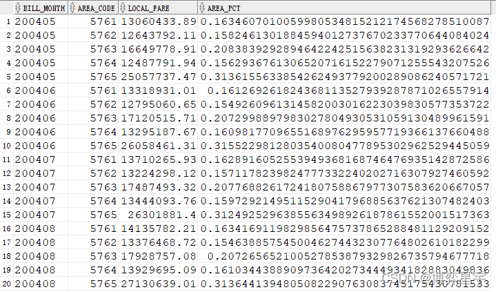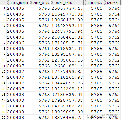 思路:先進(jìn)行g(shù)roup by bill_month, area_code使用聚合函數(shù)sum()求解出by bill_month, area_code的local_fare總和, 即sum(local_fare), 然后再運(yùn)用分析函數(shù)進(jìn)行求解每個(gè)月通話費(fèi)用最高和最低的兩個(gè)地區(qū)。