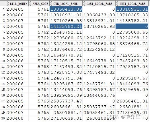 select bill_month, area_code, local_fare cur_local_fare,lag(local_fare, 1, 0) over(partition by area_code order by bill_month)last_local_fare,lead(local_fare, 1, 0) over(partition by area_code order by bill_month) next_local_farefrom (select bill_month, area_code, sum(local_fare) local_fare from t group by bill_month, area_code);