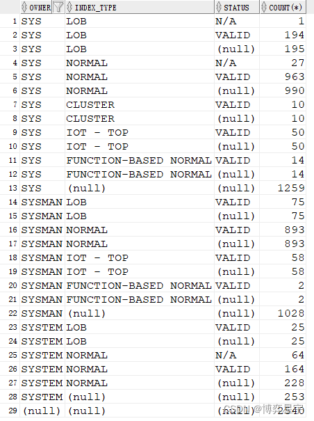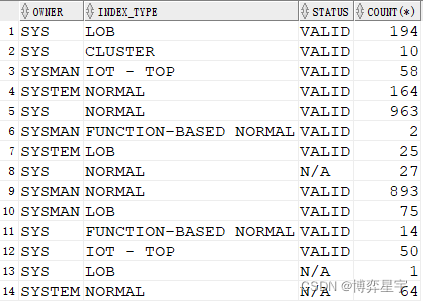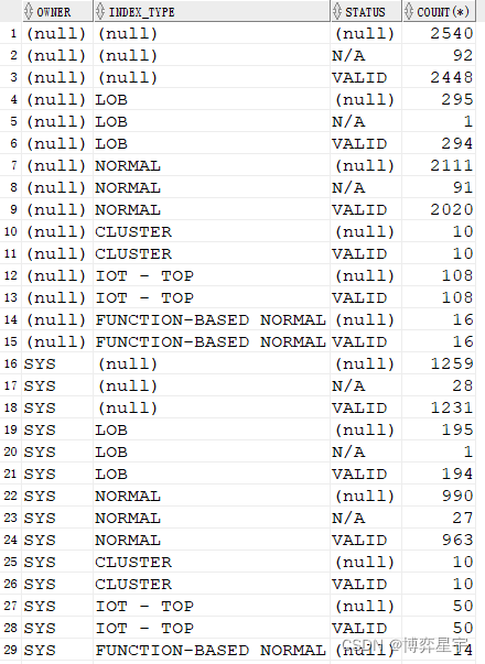 select owner, index_type, status, count(*) from tt where owner like "SY%" group by owner, index_type, status;