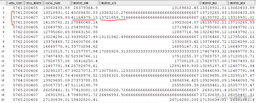 select area_code, bill_month, local_fare,sum(local_fare) over(partition by area_code order by to_number(bill_month) range between 1 preceding and 1 following) month3_sum,avg(local_fare) over(partition by area_code order by to_number(bill_month) range between 1 preceding and 1 following) month3_avg,max(local_fare) over(partition by area_code order by to_number(bill_month) range between 1 preceding and 1 following) month3_max,min(local_fare) over(partition by area_code order by to_number(bill_month) range between 1 preceding and 1 following) month3_minfrom (select bill_month, area_code, sum(local_fare) local_fare from t group by area_code, bill_month);