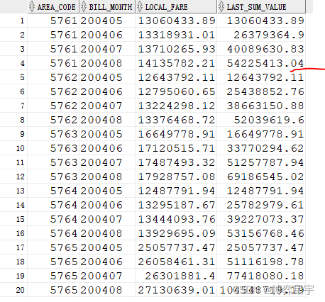 select area_code, bill_month, local_fare, sum(local_fare) over(partition by area_code order by bill_month asc) last_sum_valuefrom(select area_code, bill_month, sum(local_fare) local_fare from t group by area_code, bill_month) order by area_code, bill_month;