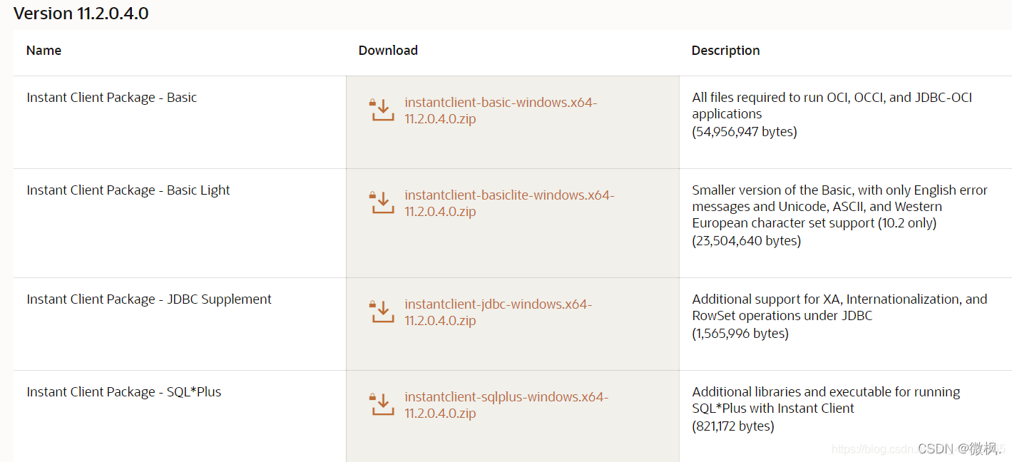 找到版本為11.2.0.4.0,選擇Instant Client Package - Basic,進行下載。