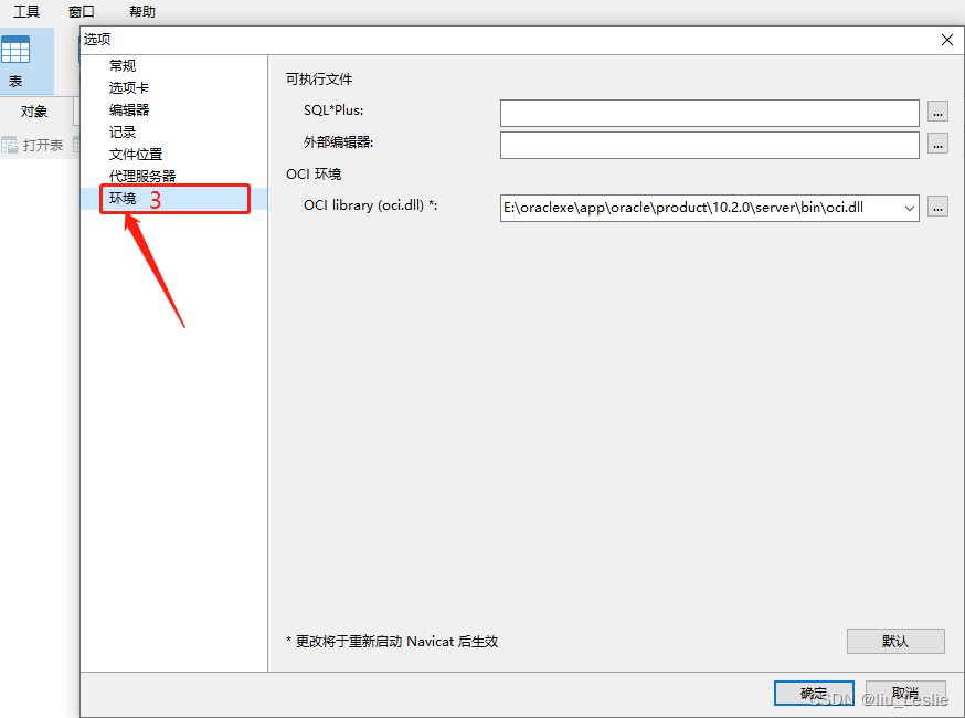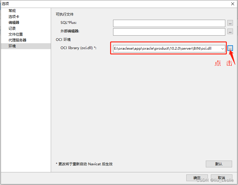 2、進入環境界面后,可以看到OCI環境選項中的 --> OCI library (oci.dll) * :E:\oraclexe\app\oracle\product\10.2.0\server\bin\oci.dll(此處的路徑是我安裝Navicat軟件后默認存在的),我們需要修改此oci.dll文件的路徑,否則會報錯。
