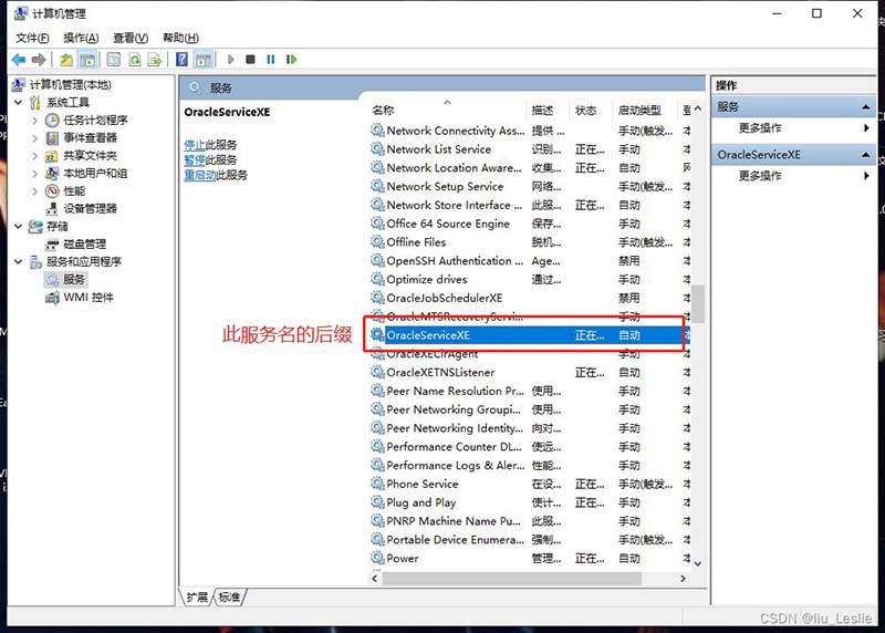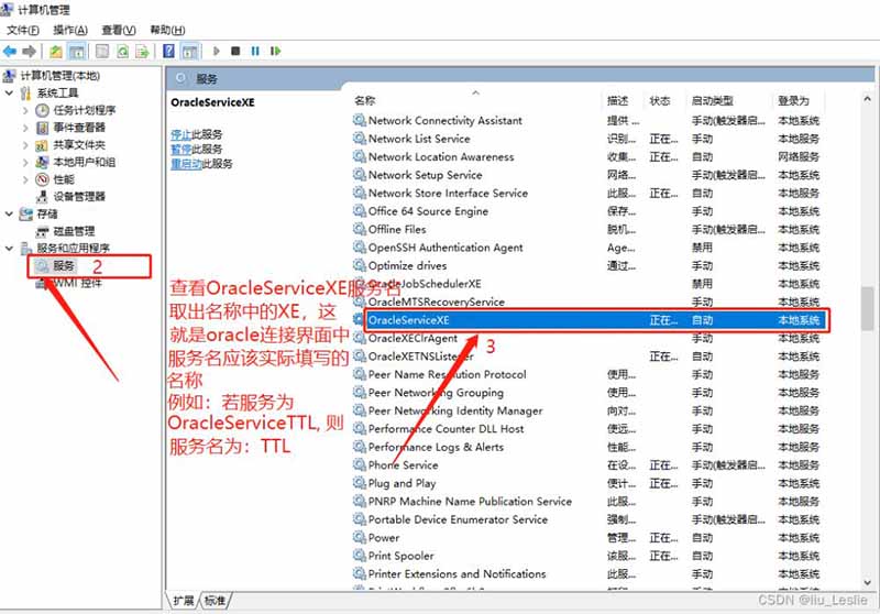 5、新建連接中有一點 “服務名” 需要注意,此服務名需要通過:右擊計算機(我的電腦) --> 管理 --> 找到服務和應用程序 --> 點擊服務打開服務列表,==找到OracleServiceXE服務名,==將 “XE” 作為服務名填入連接界面中的服務名選項。如下圖: