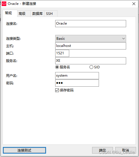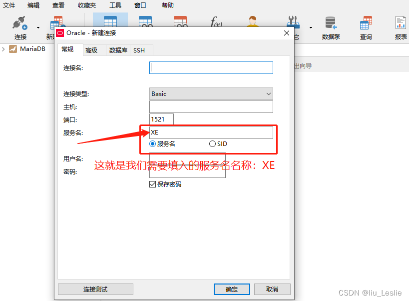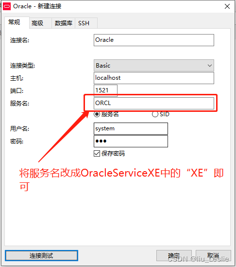 將服務名改成XE;“XE”就是之前從計算機管理中的服務與應用程序中查找到的服務OracleServiceXE中截取的后綴服務名。如下圖:
