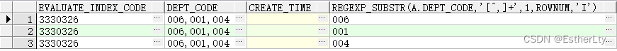 SELECT DISTINCT A.*, REGEXP_SUBSTR(A.DEPT_CODE, "[^,]+", 1, Level, "i") FROM (SELECT * FROM APP_TEMPLATE_DEPT T WHERE T.EVALUATE_INDEX_CODE = "3330326") ACONNECT BY Level<= LENGTH(A.DEPT_CODE) - LENGTH(REGEXP_REPLACE(A.DEPT_CODE, ",", "")) + 1;