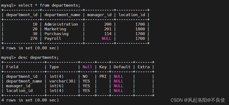 1、1 根據(jù)departments表創(chuàng)建新表departments1 departments 表結(jié)果和表數(shù)據(jù)庫如下