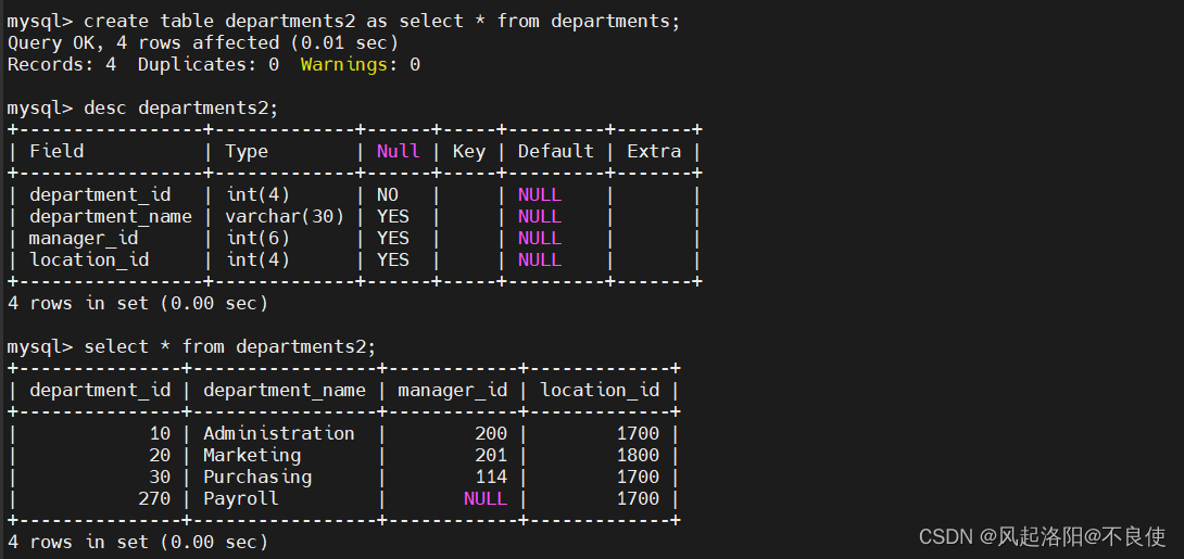 2、語法2:CREATE TABLE new_tbl [AS] SELECT {*|column,…} FROM orig_tbl;2、1 根據(jù)departments表創(chuàng)建新表departments2
