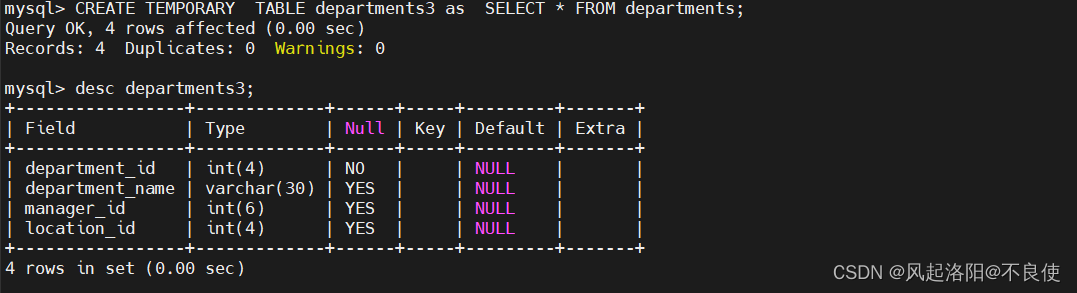 3、語法3:CREATE TEMPORARY TABLE new_tbl [AS] SELECT {*|column,…} FROM orig_tbl;3、1 根據(jù)departments表創(chuàng)建新表departments3