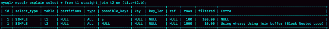 select * from t1 straight_join t2 on (t1.a=t2.a);在這個語句里,假設t1 是驅動表,t2是被驅動表。我們來看一下這條語句的explain結果。