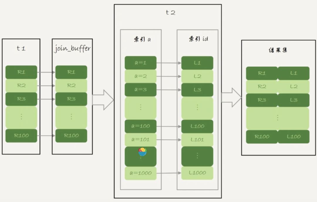 圖中,我在join_buffer中放入的數(shù)據是P1~P100,表示的是只會取查詢需要的字段。當然,如果join buffer放不下P1~P100的所有數(shù)據,就會把這100行數(shù)據分成多段執(zhí)行上圖的流程。