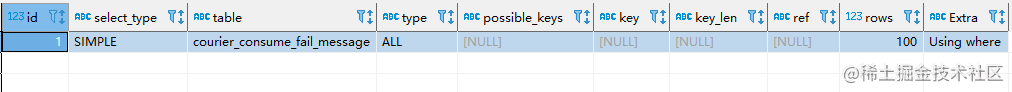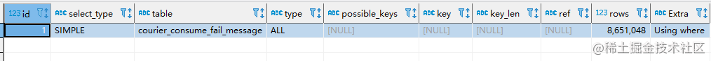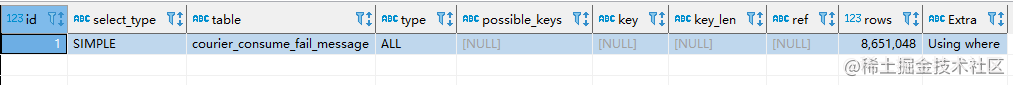在我們的生產(chǎn)環(huán)境中有一張表:courier_consume_fail_message,是存放消息消費(fèi)失敗的數(shù)據(jù)的,設(shè)計(jì)之初,這張表的數(shù)據(jù)量評(píng)估在萬級(jí)別以下,因此沒有建立索引。