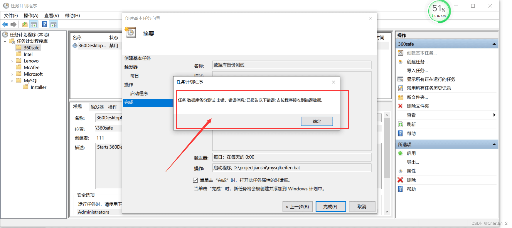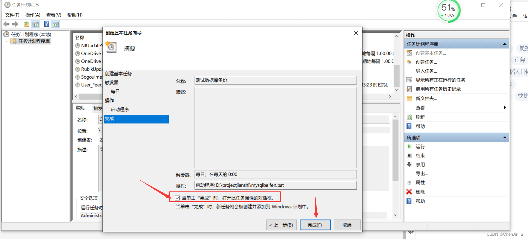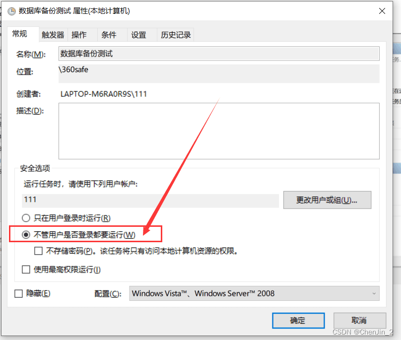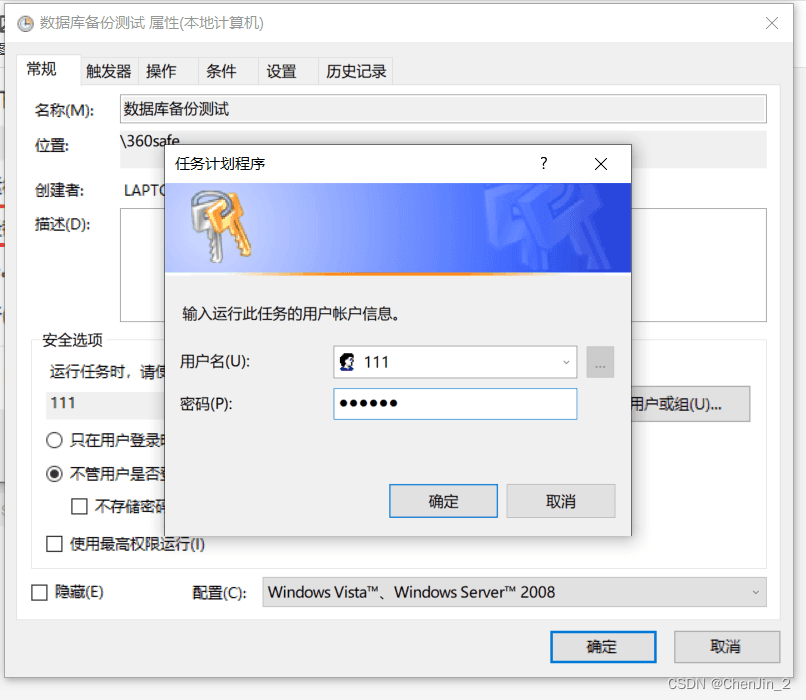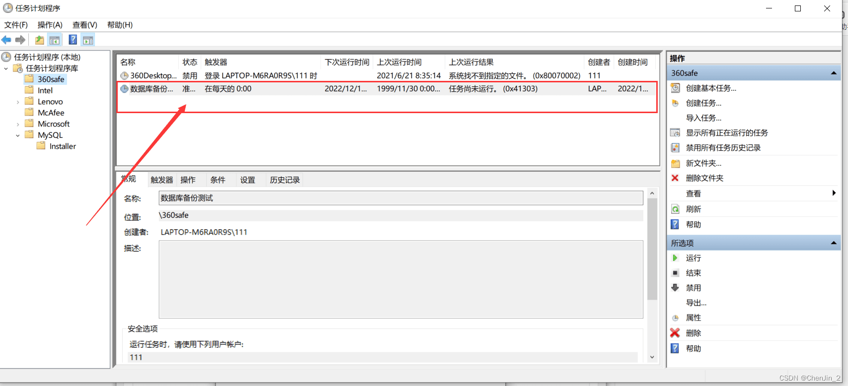 目錄1、編寫腳本xxx.bat2、實現(xiàn)定時任務(wù)2.1、打開任務(wù)計劃程序2.2、創(chuàng)建基本任務(wù)2.3、輸入名稱 點擊下一步2.4、設(shè)置觸發(fā)器 點擊下一步2.4、設(shè)置執(zhí)行時間 點擊下一步2.5、設(shè)置自動程序 點擊下一步2.6、選擇腳本所在位置 點擊下一步2.7、點擊完成2.8、設(shè)置安全選項2.9、點擊確定輸入自己電腦密碼再次點擊確定。2.10、任務(wù)設(shè)置成功總結(jié)1、編寫腳本xxx.bat@echo offecho 設(shè)置MySql數(shù)據(jù)庫的連接信息set host=127.0.0.1set port=3306set user=rootset pass=123456echo 設(shè)置要備份MySql數(shù)據(jù)庫名稱set dbname=projectmonitoringecho 獲取當(dāng)天的日期格式,例如:2022-12-13-14-30-40set backup_date=%date:~0,4%-%date:~5,2%-%date:~8,2%-%time:~0,2%-%time:~3,2%-%time:~6,2%echo 設(shè)置備份文件的路徑set backupfile=D:\projectjianshi\sql\mysql\%dbname%-%backup_date%.sqlecho 使用mysqldump對指定的MySql進(jìn)行備份echo 注意路徑中有空格的要加上雙引號'C:\Program Files\MySQL\MySQL Server 5.7\bin\mysqldump' -h%host% -P%port% -u%user% -p%pass% -c --add-drop-table %dbname% > %backupfile%echo 刪除過期文件,這里是超過30天就刪除forfiles /p D:\projectjianshi\sql\mysql\ /s /m *.sql /d -30 /c 'cmd /c del @file /f'exist2、實現(xiàn)定時任務(wù)2.1、打開任務(wù)計劃程序